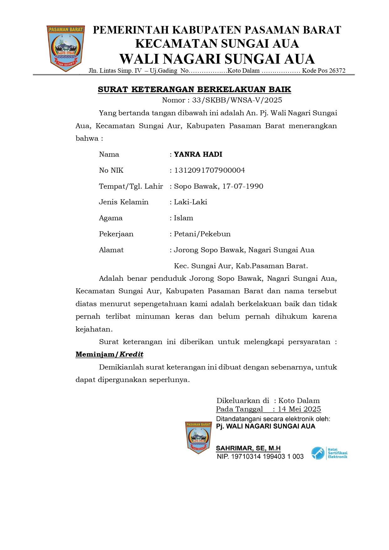 Inovasi PENA WASBOT (Pelayanan Nagari Lewat WhatsApp Bot) merupakan terobosan digital yang dikembangkan oleh Pemerintah Nagari Sungai Aua sebagai upaya peningkatan kualitas pelayanan publik yang cepat, mudah, dan terjangkau. Inovasi ini didasarkan pada sejumlah regulasi penting, antara lain Undang-Undang Nomor 25 Tahun 2009 tentang Pelayanan Publik, Undang-Undang Nomor 6 Tahun 2014 tentang Desa, serta Peraturan Menteri Komunikasi dan Informatika Republik Indonesia Nomor 20 Tahun 2016 tentang Perlindungan Data Pribadi dalam Sistem Elektronik. Selain itu, PENA WASBOT juga mendukung semangat digitalisasi pelayanan publik sebagaimana diamanatkan dalam Sistem Pemerintahan Berbasis Elektronik (SPBE).